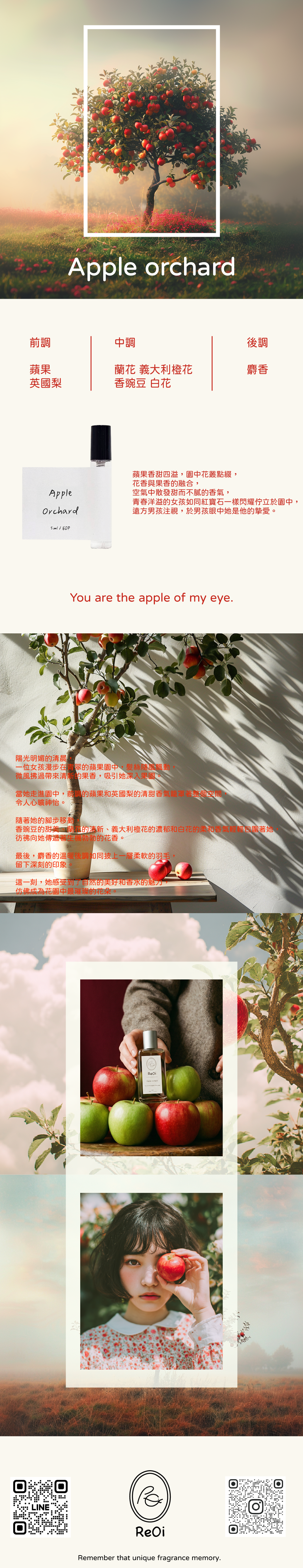 蘋果香甜四溢,園中花叢點綴,花香與果香的融合,空氣中散發甜而不膩的香氣,青春洋溢的女孩如同紅寶石一樣閃耀佇立於園中,遠方男孩注視,於男孩眼中她是他的摯愛。