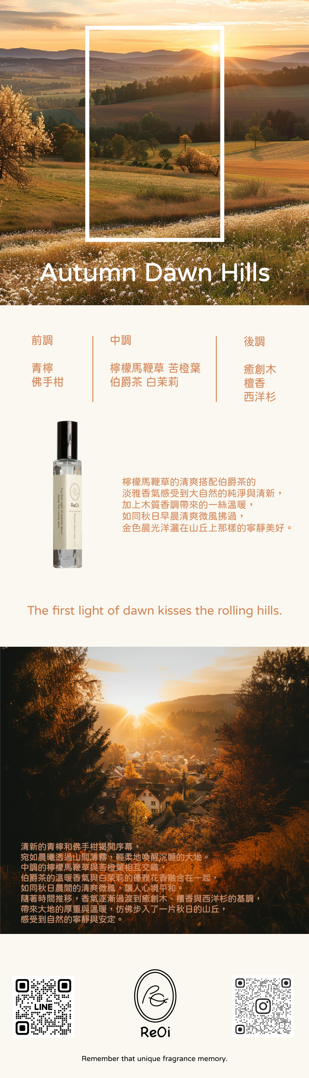 檸檬馬鞭草的清爽搭配伯爵茶的淡雅香氣感受到大自然的純淨與清新,加上木質香調帶來的一絲溫暖,如同秋日早晨清爽微風拂過,金色晨光洋灑在山丘上那樣的寧靜美好。