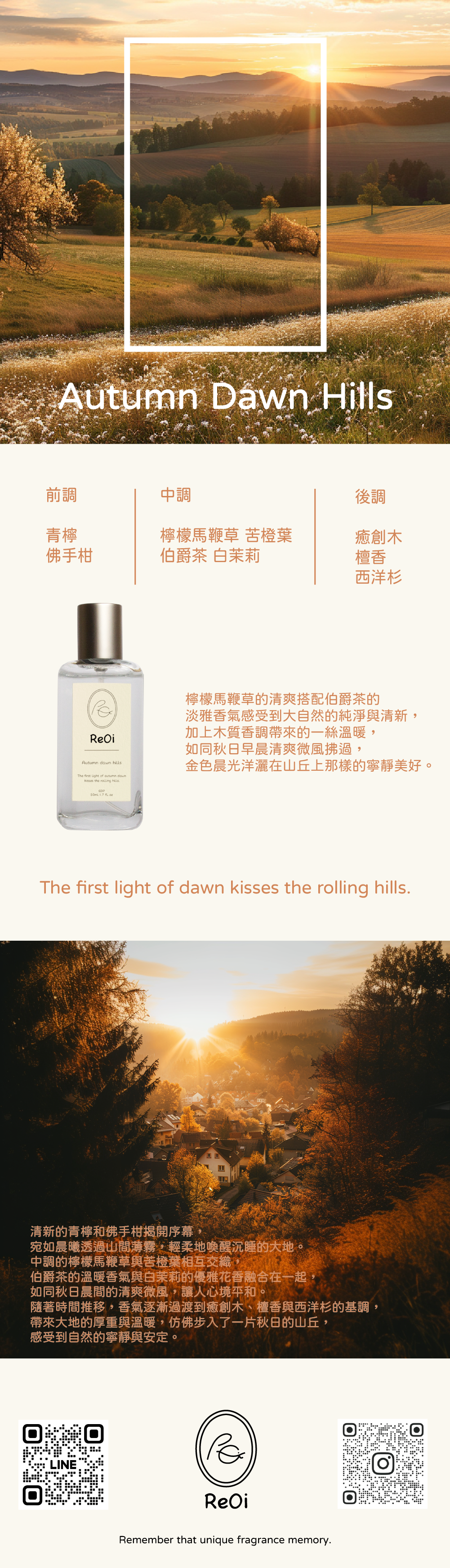 檸檬馬鞭草的清爽搭配伯爵茶的淡雅香氣感受到大自然的純淨與清新,加上木質香調帶來的一絲溫暖,如同秋日早晨清爽微風拂過,金色晨光洋灑在山丘上那樣的寧靜美好。